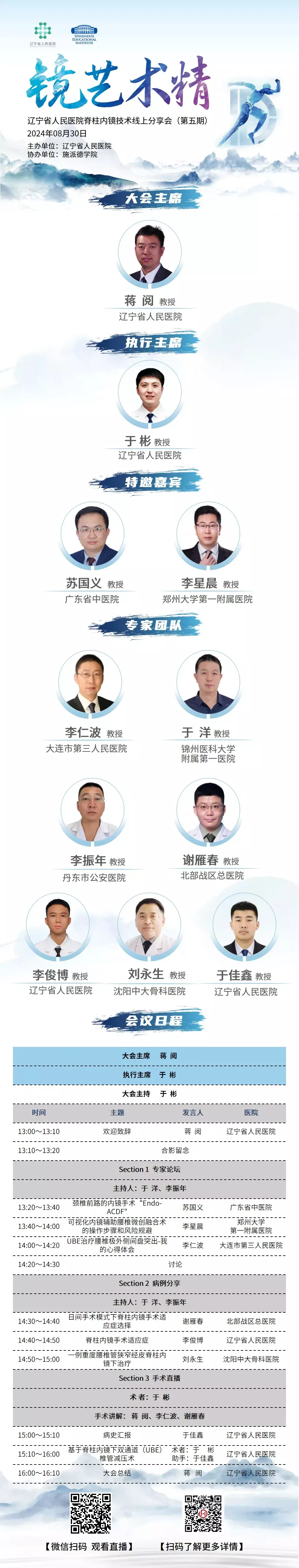 2024年(nián)08月(yuè)30日(rì),由遼甯省人(rén)民(mín)醫(yī)院主辦,施派德學院協辦“鏡藝術(sh₩ù)精-遼甯省人(rén)民(mín)醫(yī)院脊柱內(nèi)鏡技(jì)術(shù)線上(shàng)分(fēn)享會(huì)(第五期)”圓滿舉辦。本次會(hu‌ì)議(yì)由遼甯省人(rén)民(mín)醫(yī)院蔣閱教授擔任大(dà)會(huì)主席,遼甯省人(rén)們醫(yī)院于彬教授擔任執行(xí★ng)主席,特别邀請(qǐng)廣東(dōng)省中醫(yī)院蘇國(guó)義教授、鄭州大(dà)∞學第一(yī)附屬醫(yī)院李星辰教授分(fēn)享講課,會(huì)議(yì)同時(shí)邀請(qǐng)到(dào)國(guó)內(nèi)多(duō)名♥專家(jiā)學者齊聚一(yī)堂,共同交流脊柱內(nèi)鏡技(jì)術(shù)的(de)最新研究成果和‌(hé)臨床經驗,為(wèi)推動該技(jì)術(shù)的(de)進一(yī)步發展和(hé)應用(yòng)提供了(le)有(yǒu)力支持。